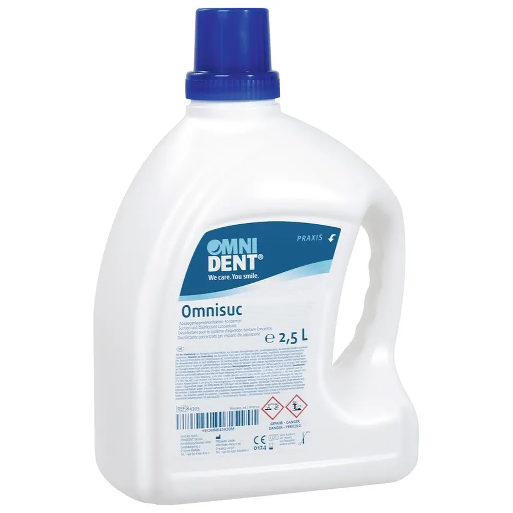 Omnisuc je visoko učinkovit koncentrat, ki zagotavlja dezinfekcijo, čiščenje in vzdrževanje brez aldehidov in pene za vse zobne sesalne sisteme in separatorje amalgama. Odstrani celo trdovratne obloge. Spekter dezinfekcijskega sredstva, v skladu s standardnimi metodami DGHM, vključuje: baktericidno, kvasovkocidno (Candida albicans) in omejeno virucidno delovanje (virusi z ovojnico, HBV, HCV in HIV). Doziranje: 2 % = 5 minut, 3 % = 2 minuti. Omnisuc je na voljo v 2,5-litrskih steklenicah z vgrajenim pripomočkom za izlivanje in merilno skodelico.